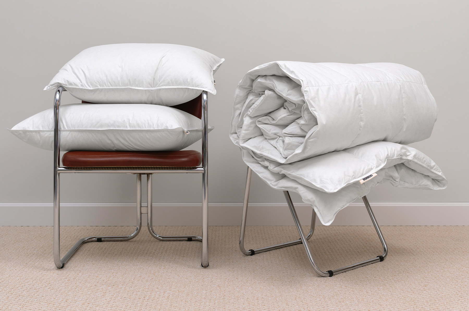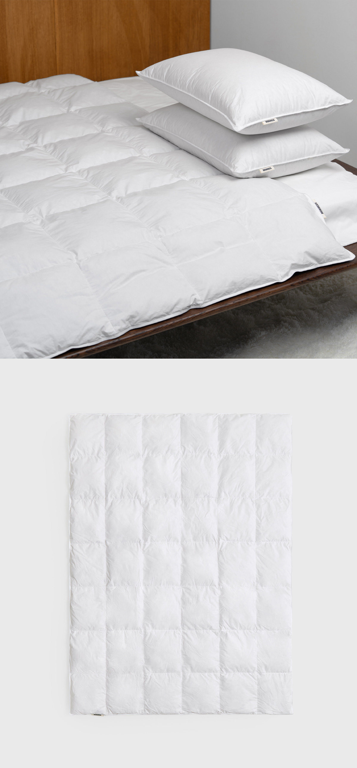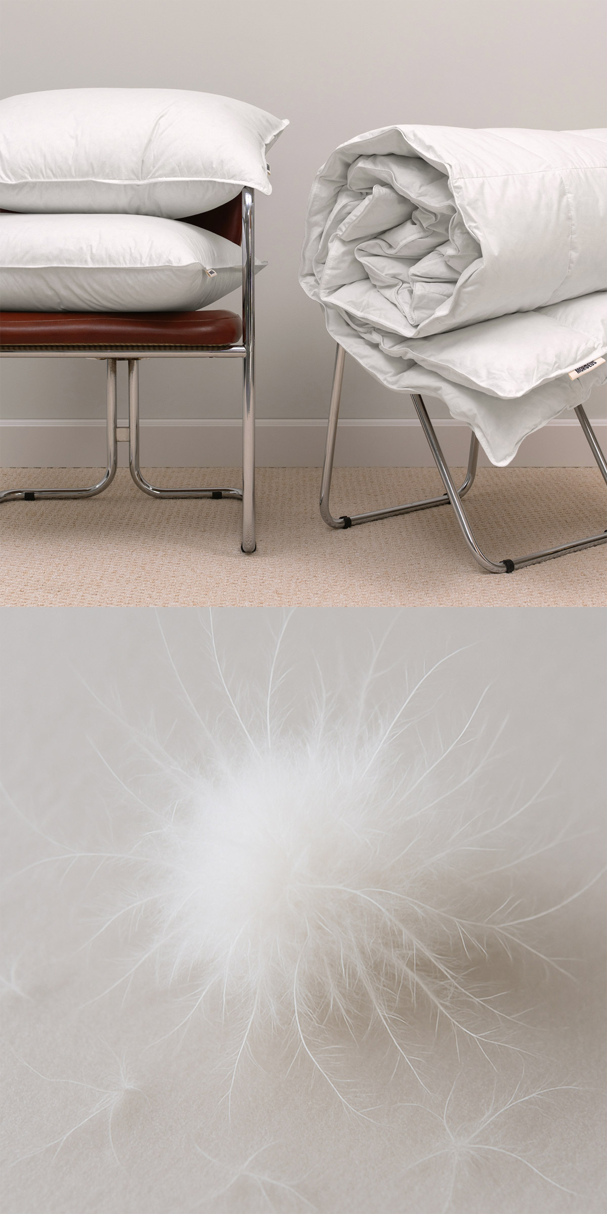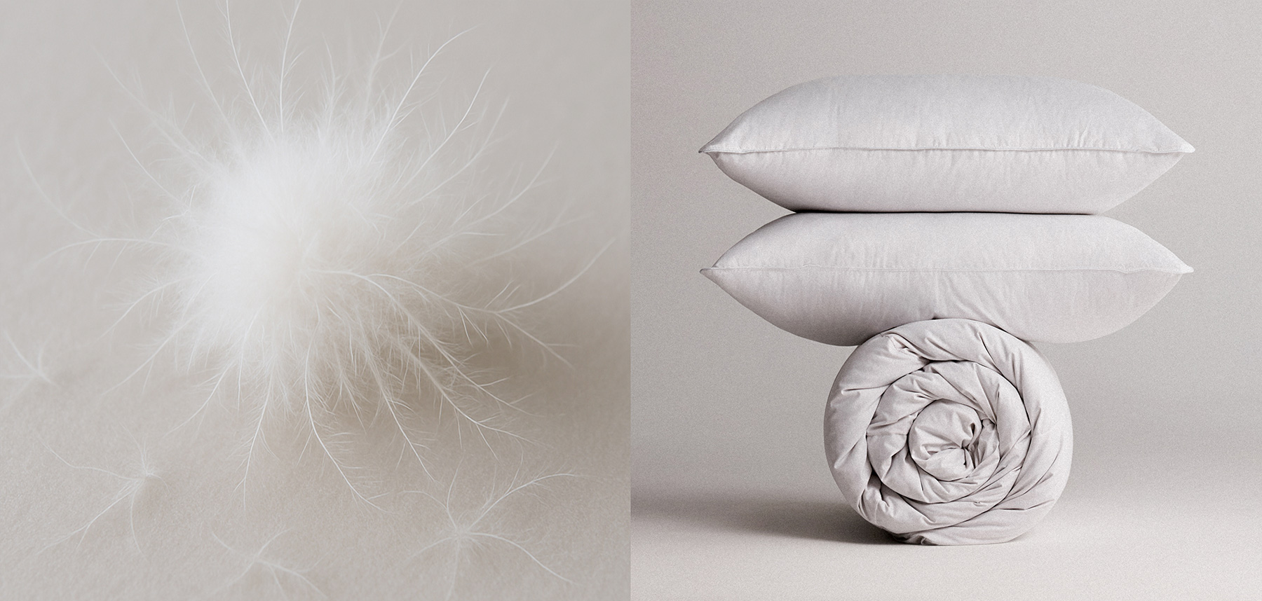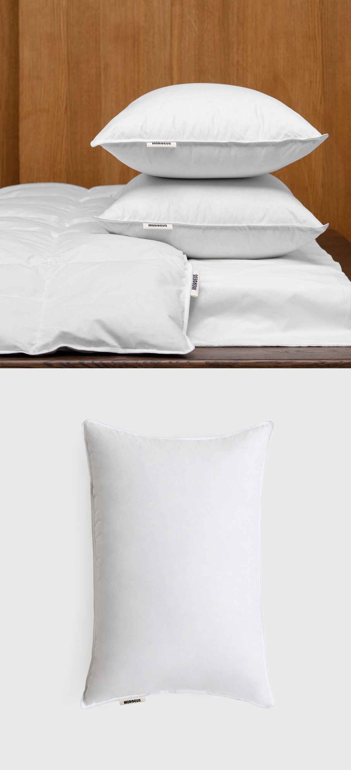 В основе коллекции — 100% белый гусиный пух. Этот редкий материал считается эталоном для подушек и одеял премиум-качества. По сравнению с более доступными наполнителями, чистый белый пух отличается упругостью и высокой теплоизоляцией, сохраняя лёгкость. При нажатии пух издаёт приятный хруст — характерный признак настоящего пухового наполнителя высокого качества.