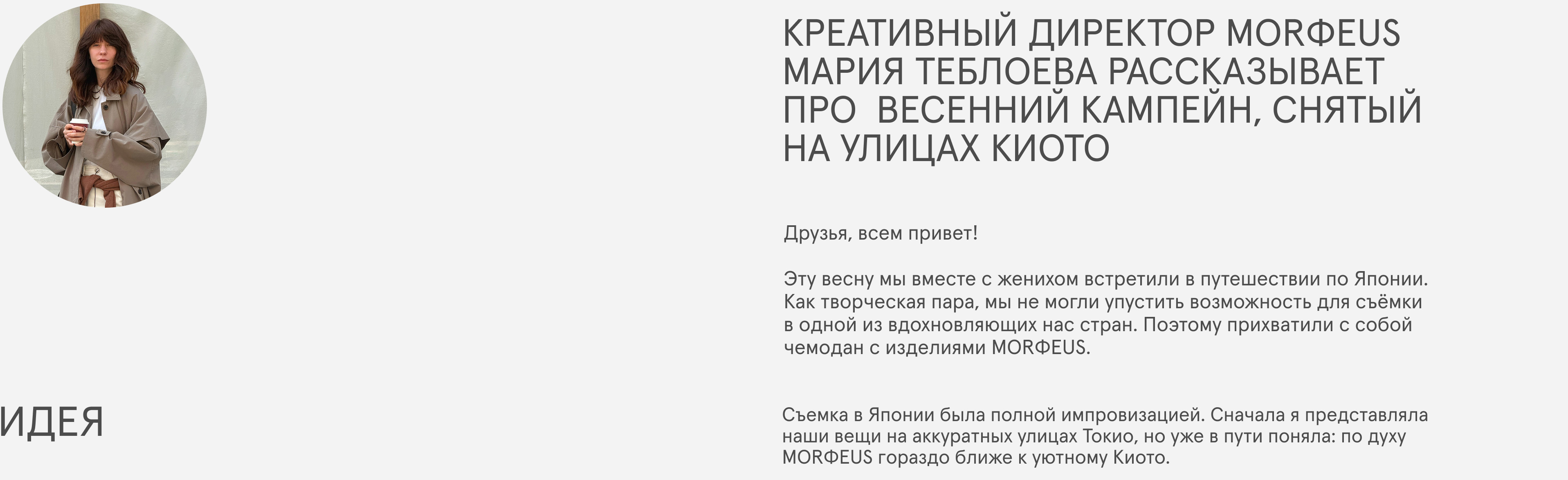Съемка в Японии была полной импровизацией. Сначала я представляла наши вещи на аккуратных улицах Токио, но уже в пути поняла: по духу MORФEUS гораздо ближе к уютному Киото.