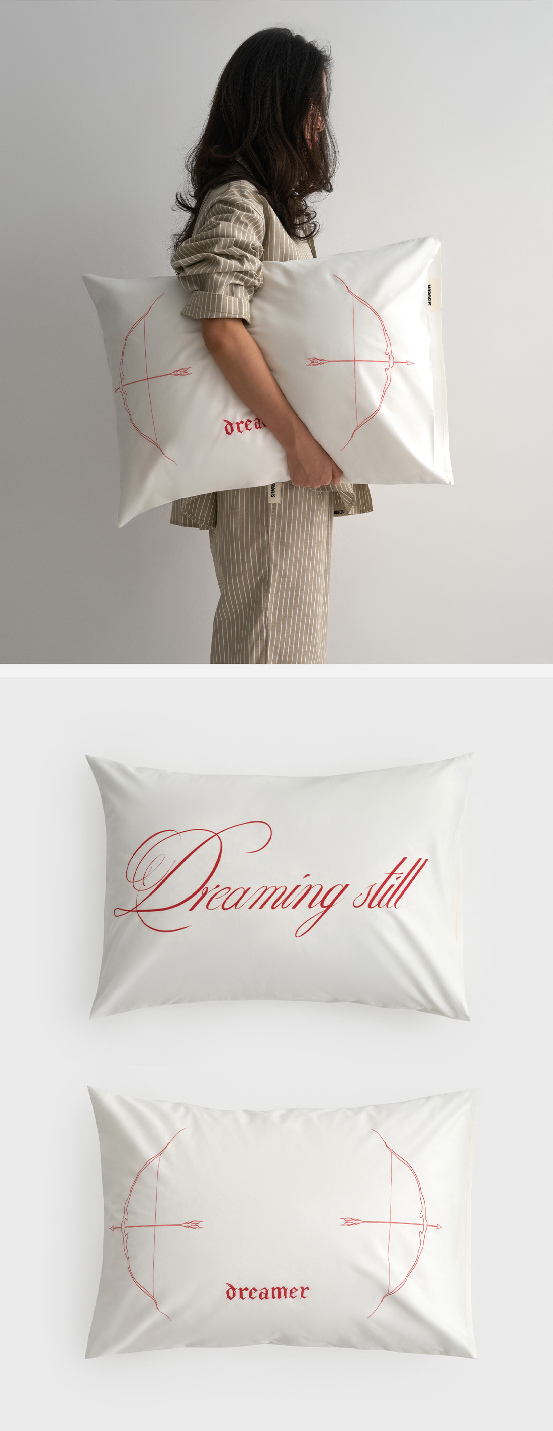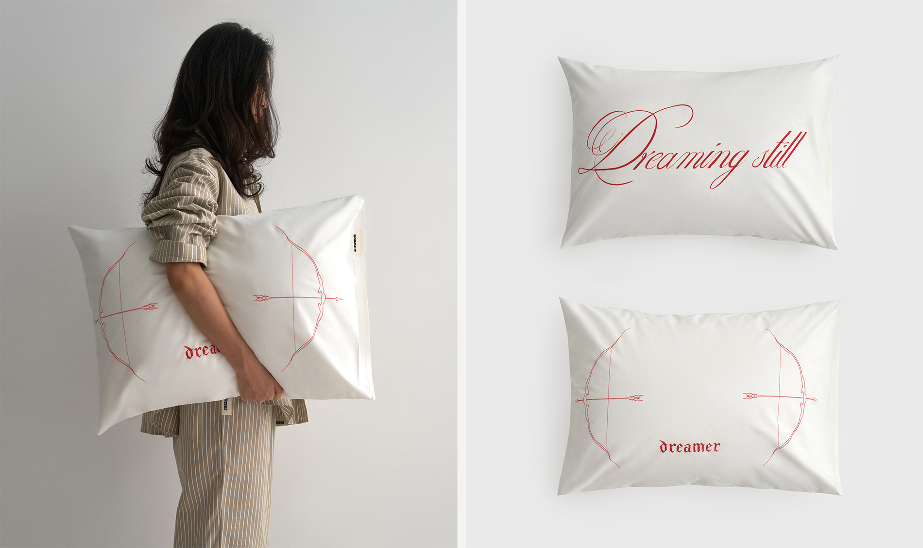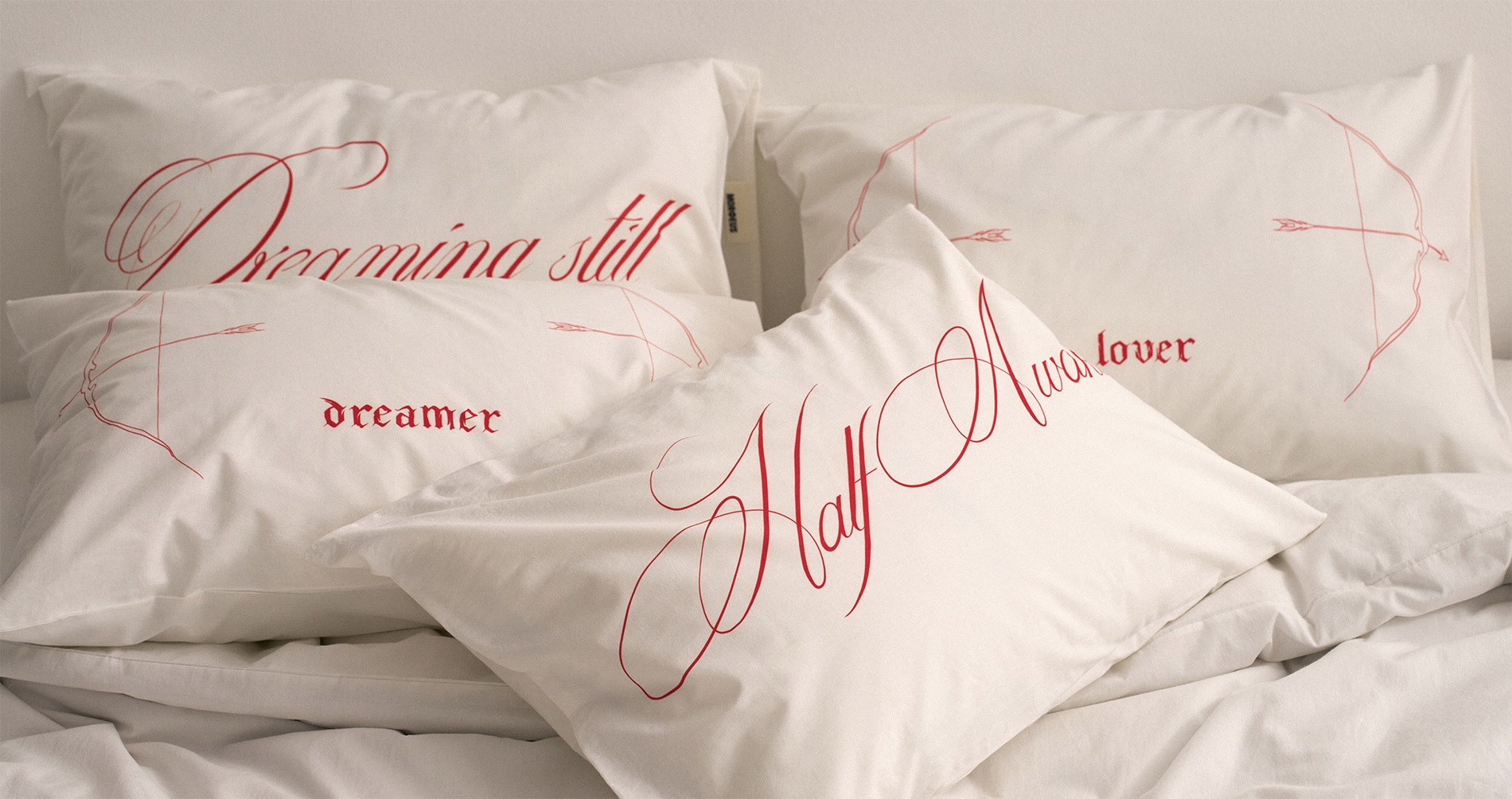 Представляем коллаборацию Dreamers с главным тату-артистом Москвы Ульяной Абизяевой. Это наволочки из натурального шёлка и варёного хлопка с тонкими надписями и графикой красного цвета. Они — про ежедневное удовольствие засыпать рядом с любимым человеком.
