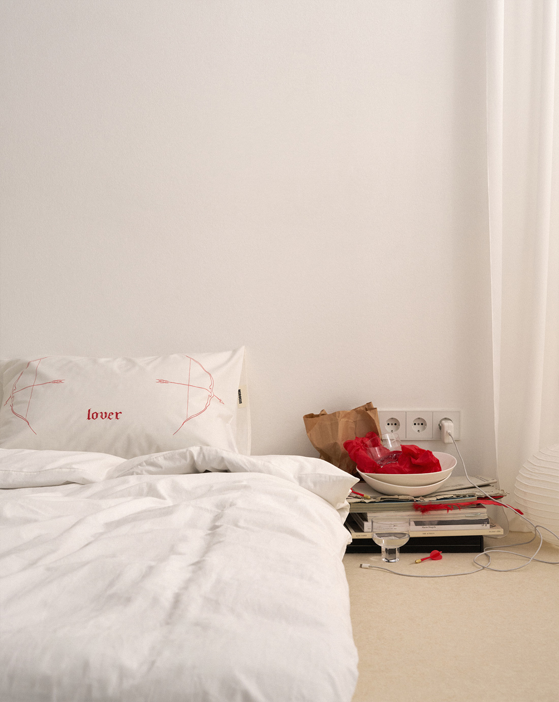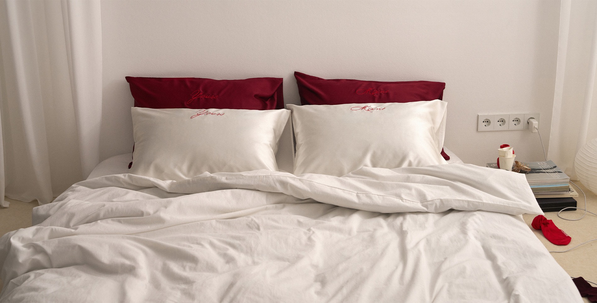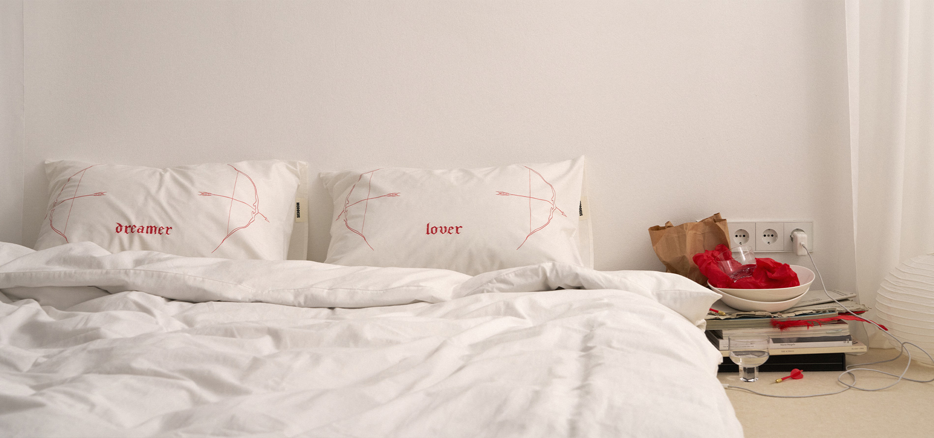 Представляем коллаборацию Dreamers с главным тату-артистом Москвы Ульяной Абизяевой. Это наволочки из натурального шёлка и варёного хлопка с тонкими надписями и графикой красного цвета. Они — про ежедневное удовольствие засыпать рядом с любимым человеком.