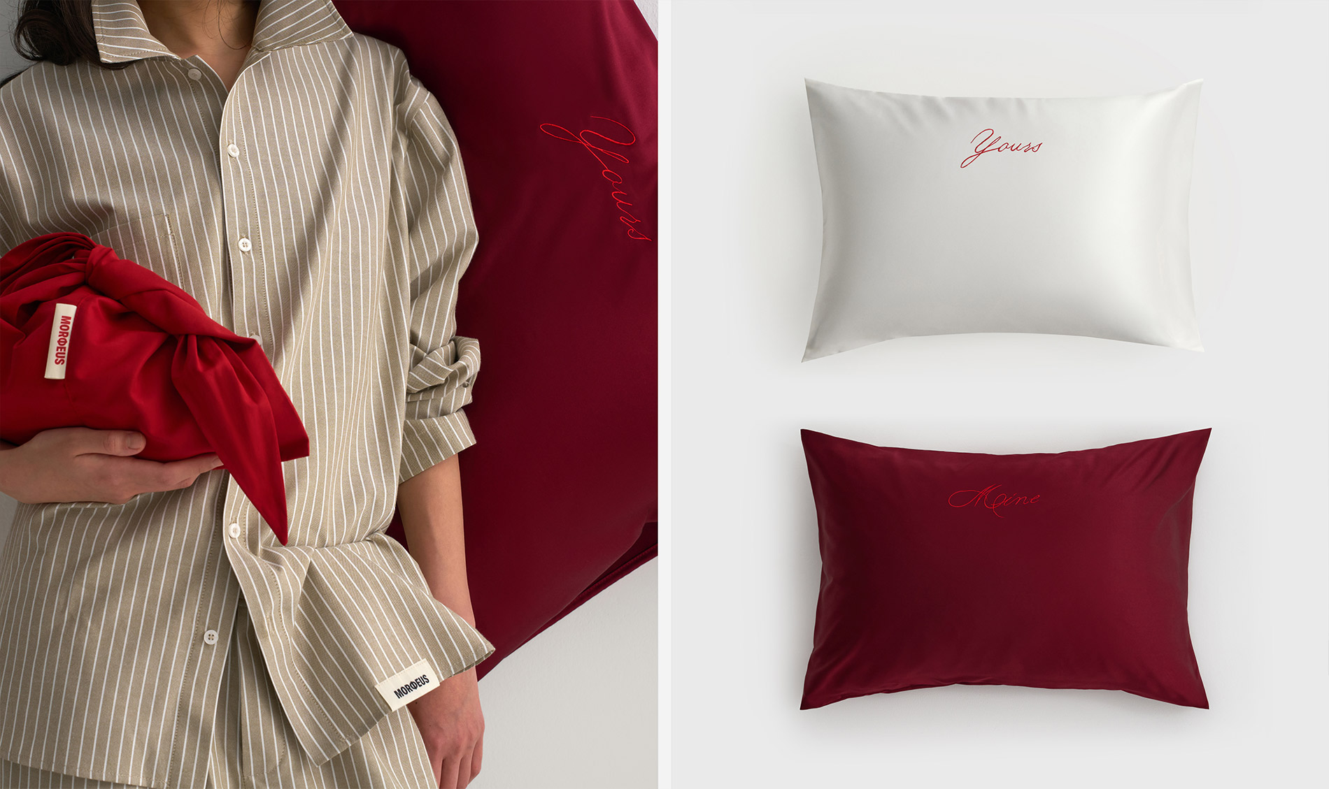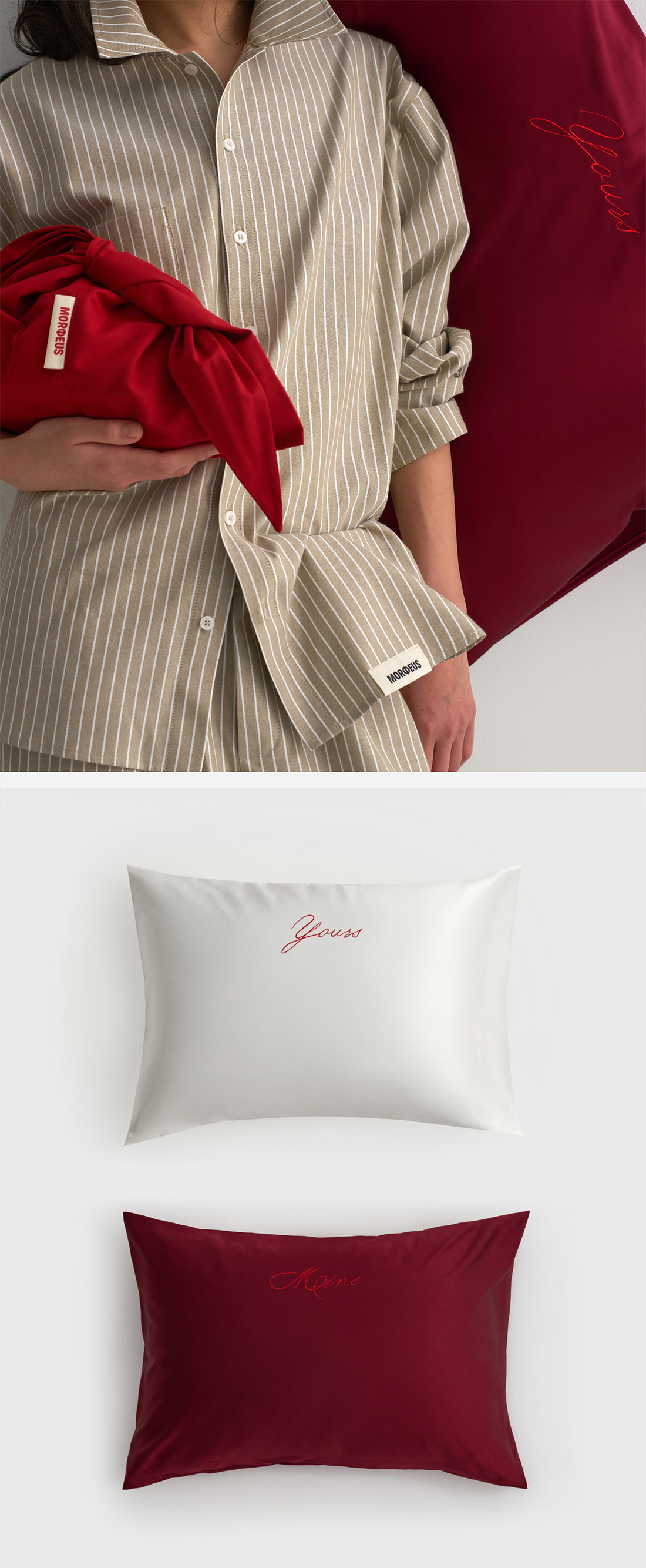 Выполнены из 100% итальянского шёлка Mulberry в белом и бордовом цветах. Надписи Mine и Yours дополняют друг друга: можно сочетать две наволочки в одном или разных оттенках. Деликатная вышивка станет тонким намёком, что для признаний не нужно ждать особенной даты, ведь каждый день вместе — уже праздник.