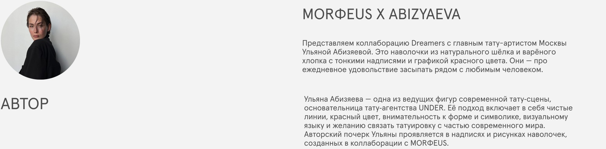 Ульяна Абизяева — одна из ведущих фигур современной тату‑сцены, основательница тату‑агентства UNDER. Её подход включает в себя чистые линии, красный цвет, внимательность к форме и символике, визуальному языку и желанию связать татуировку с частью современного мира. Авторский почерк Ульяны проявляется в надписях и рисунках наволочек, созданных в коллаборации с MORФEUS.