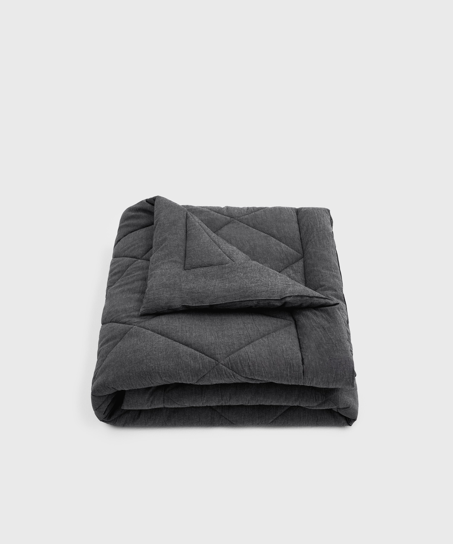 Одноцветное одеяло-комфортер, которое можно не заправлять в пододеяльник. Снаружи — мягкий варёный хлопок. Внутри — гипоаллергенный наполнитель файбер, по структуре напоминающий лебяжий пух. Он лёгкий, упругий, хорошо пропускает воздух и сохраняет тепло, быстро сохнет после стирки.
