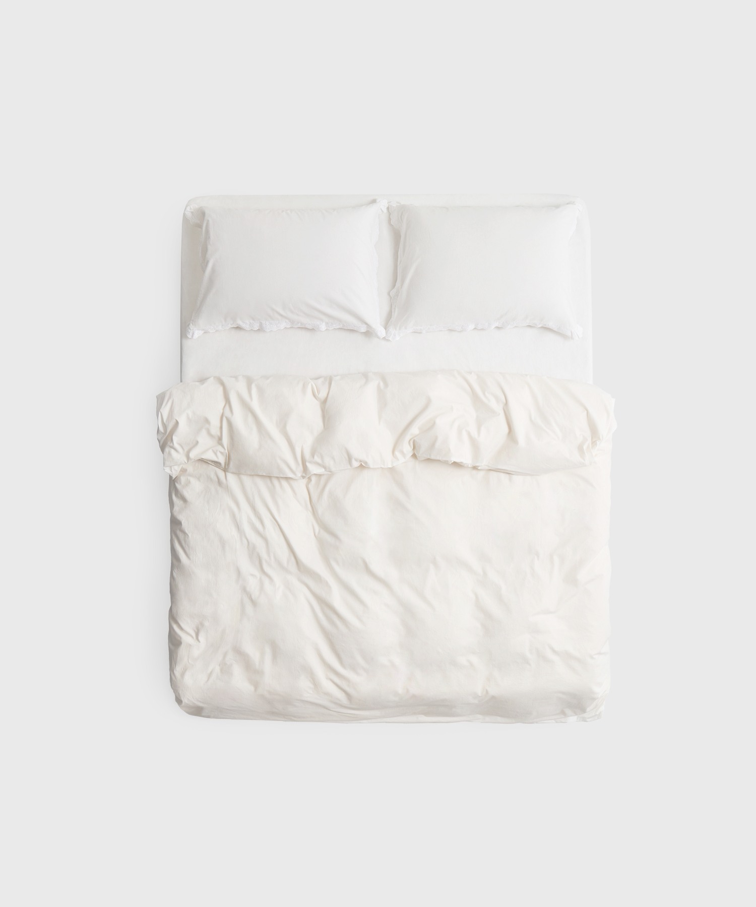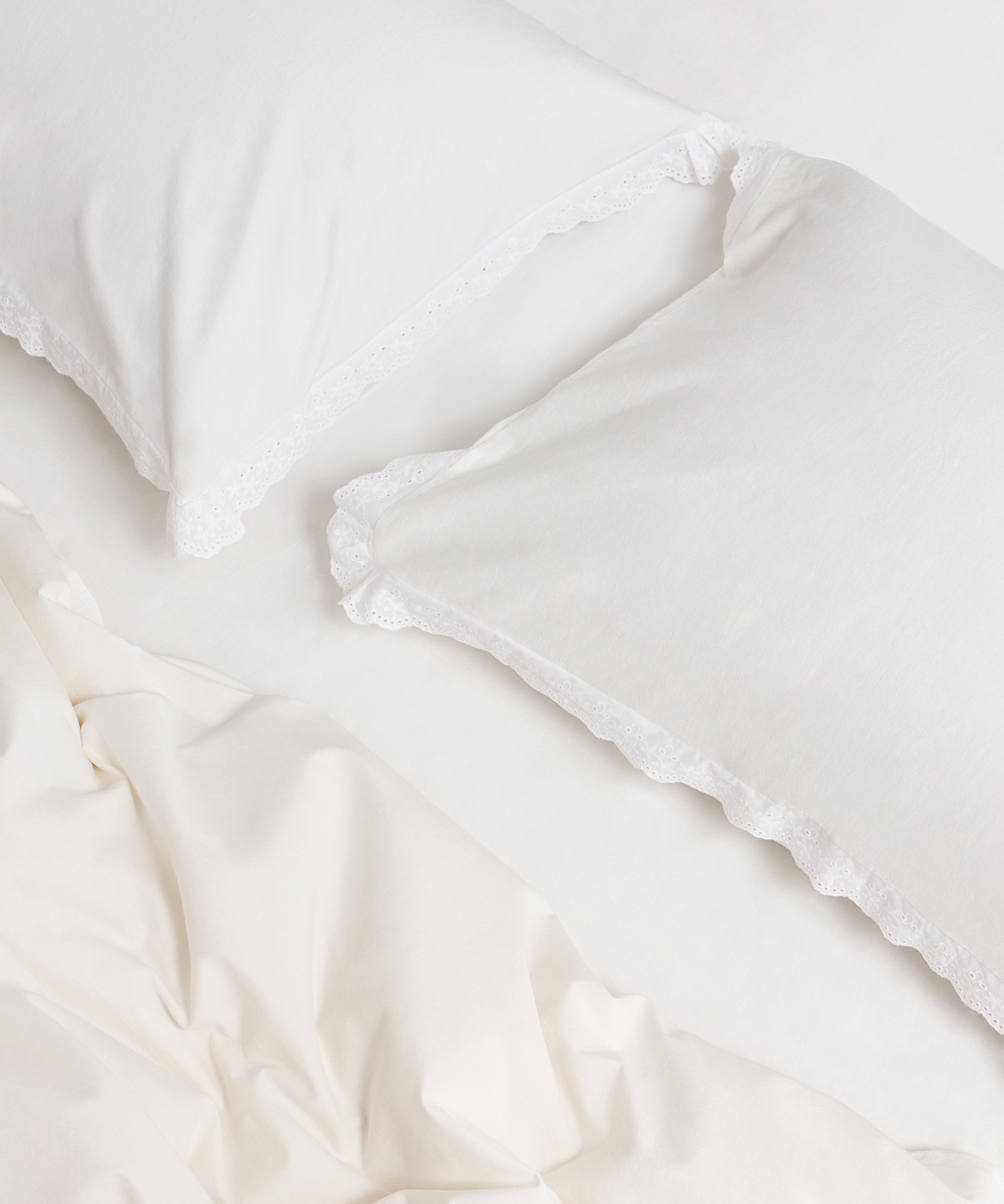 Наволочка из натурального варёного хлопка в оттенке Pure. Край наволочки украшен деликатным кружевом-шитьём, отсылающим к эстетике романтизма и традиции сна на белоснежных пуховых перинах.