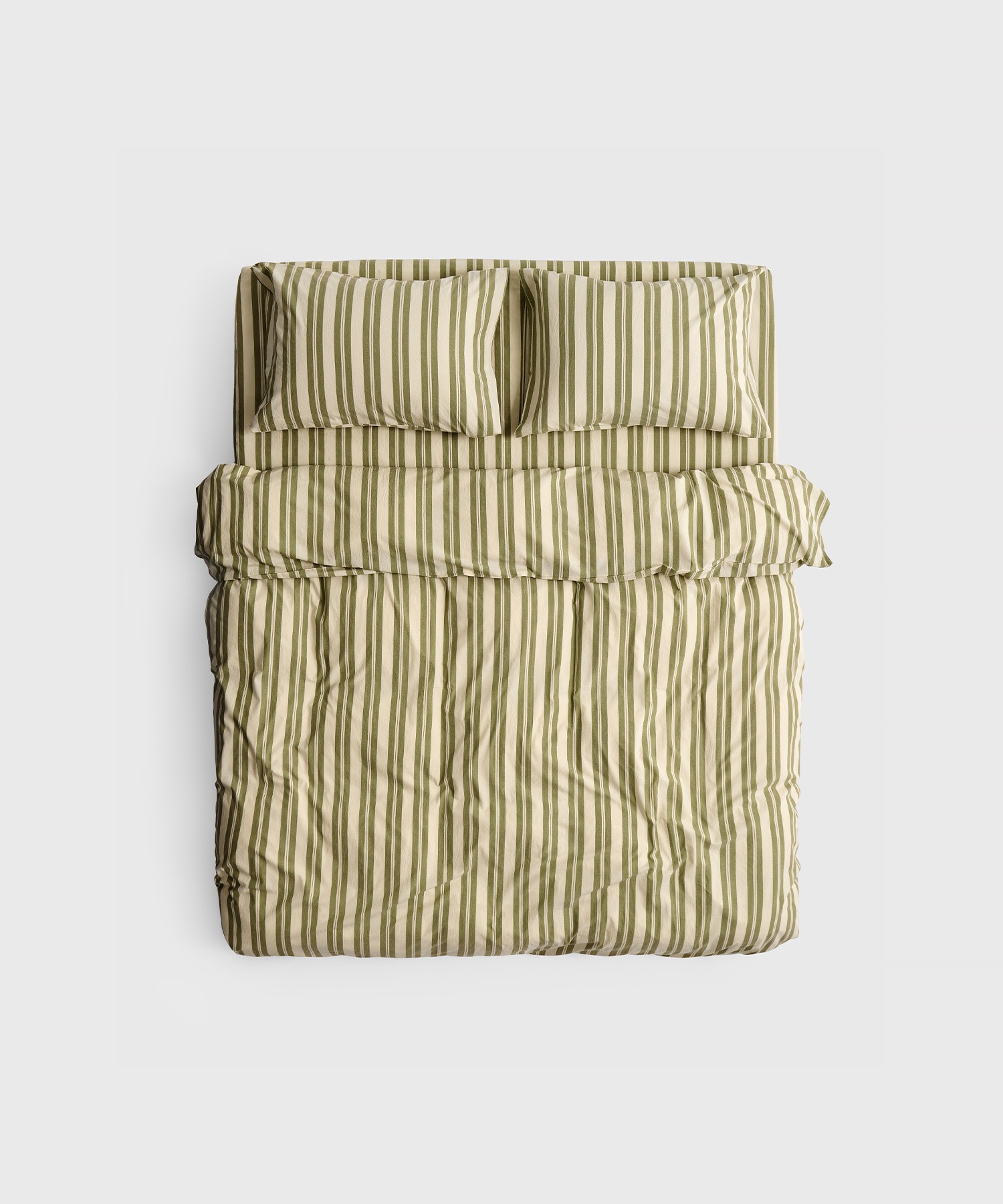 Мягкий, натуральный хлопок с авторской полоской бренда. Плотный на ощупь, отлично смотрится без глажки.