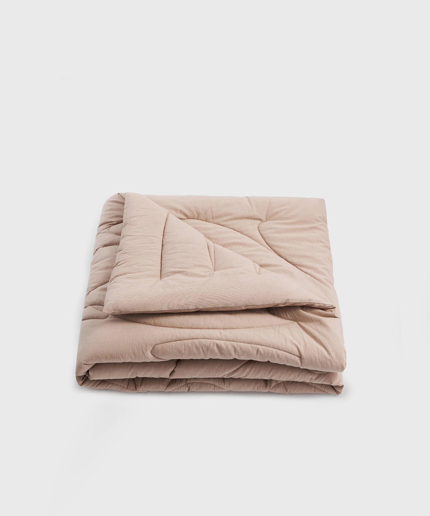 Одеяло-комфортер, которое можно не заправлять в пододеяльник. Снаружи — мягкий варёный хлопок. Внутри — гипоаллергенный наполнитель с эвкалиптовым волокном. Оно обладает природными антибактериальными свойствами и хорошо пропускает воздух.