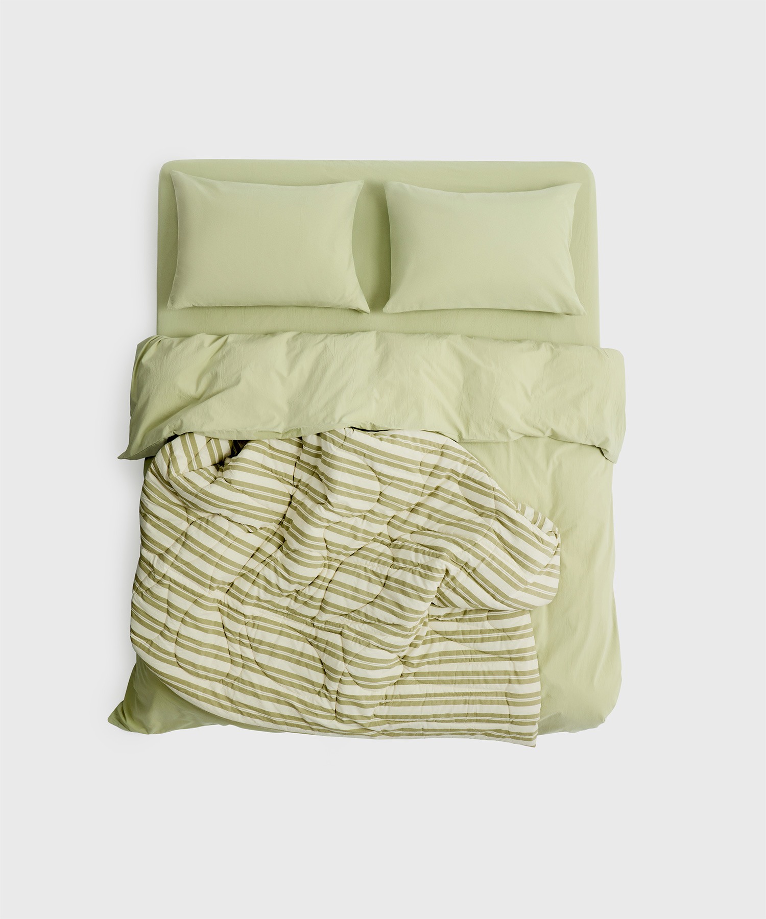 Одеяло-комфортер, которое можно не заправлять в пододеяльник. Снаружи — мягкий варёный хлопок. Внутри — гипоаллергенный наполнитель с эвкалиптовым волокном. Оно обладает природными антибактериальными свойствами и хорошо пропускает воздух.