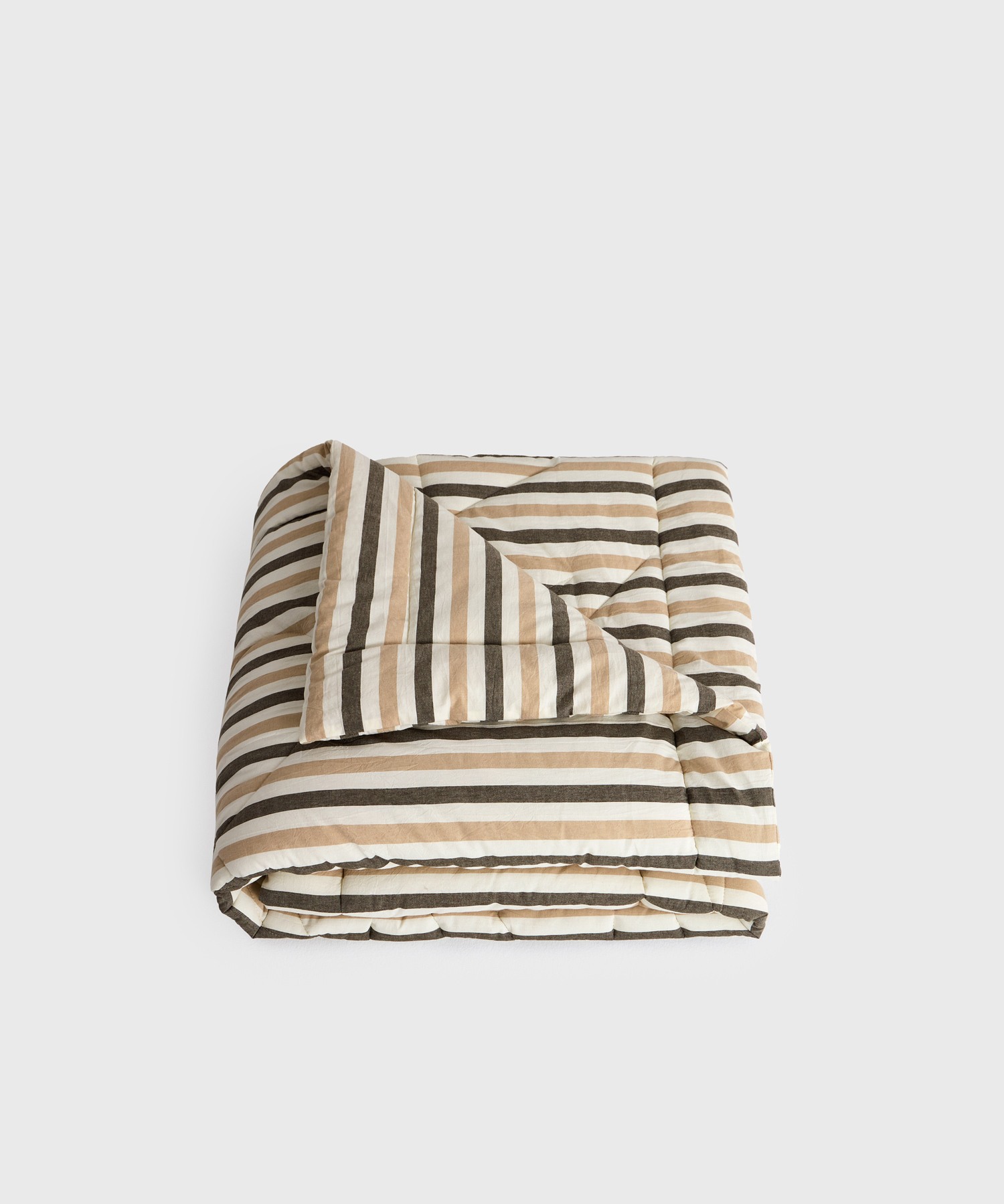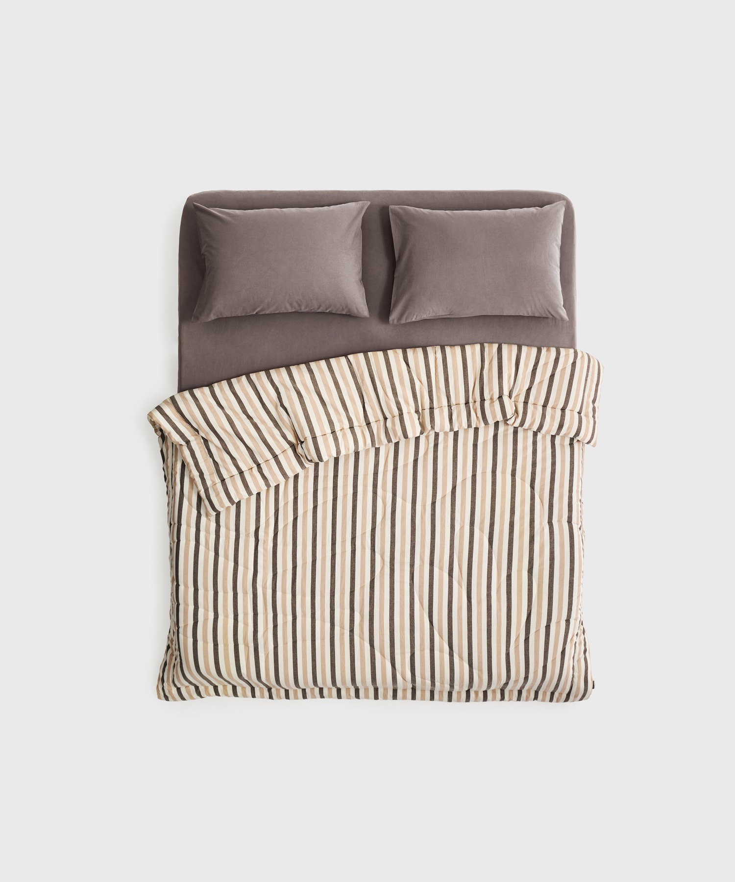 Двустороннее одеяло-комфортер, которое можно не заправлять в пододеяльник. Снаружи — мягкий варёный хлопок. Внутри — гипоаллергенный наполнитель с эвкалиптовым волокном. Оно обладает природными антибактериальными свойствами и хорошо пропускает воздух.