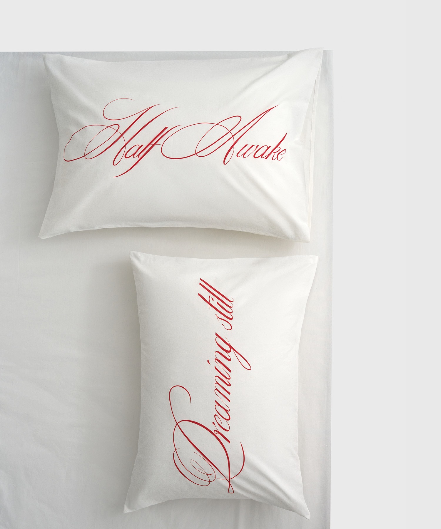 Наволочку Dreaming still можно дополнить хлопковой наволочкой Half Awake из коллаборации. Они доступны по отдельности и складываются в любовное послание, если положить их рядом. Изделие также сочетается с любыми другими наволочками из коллаборации MORФEUS х Abizyaeva.
