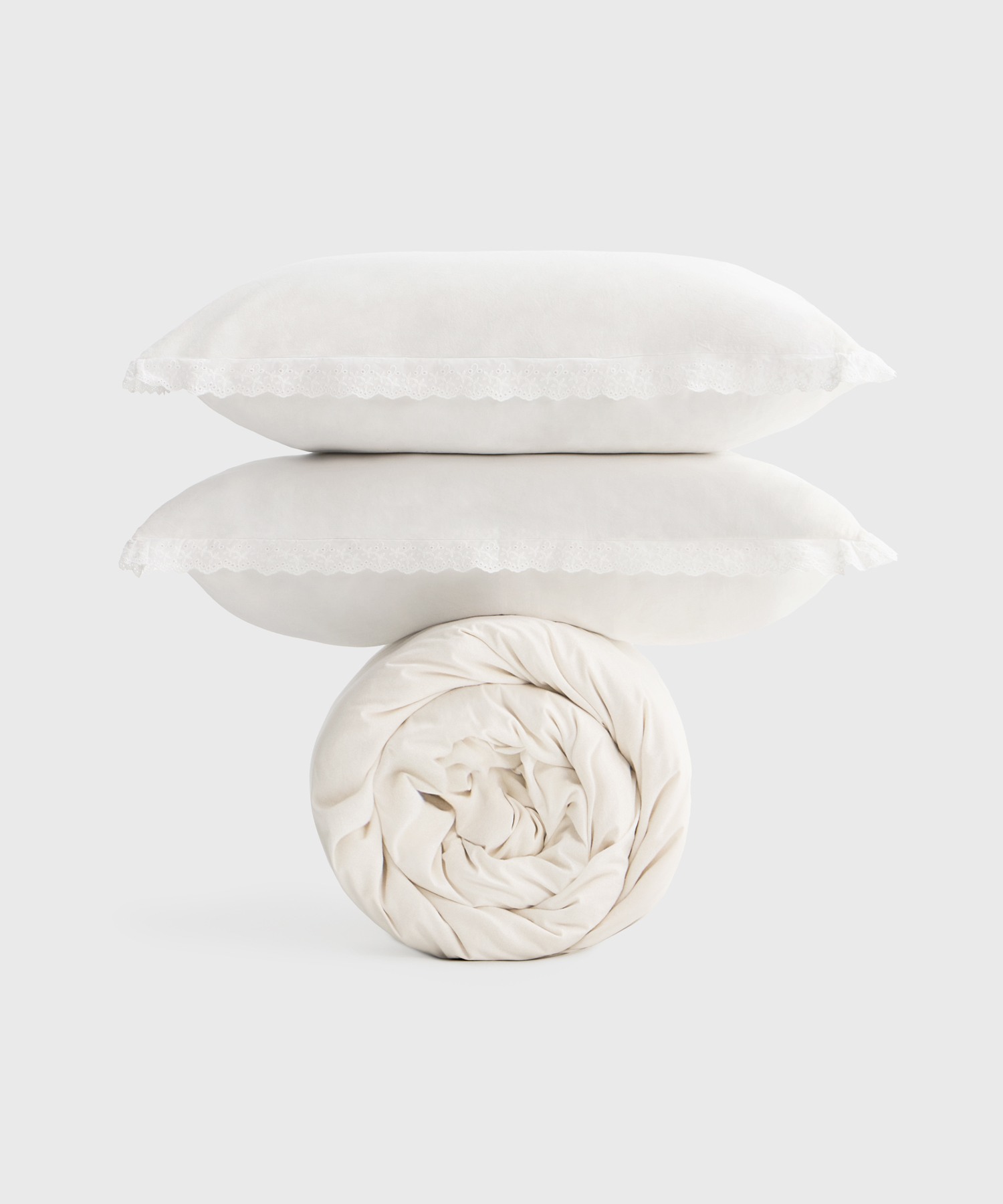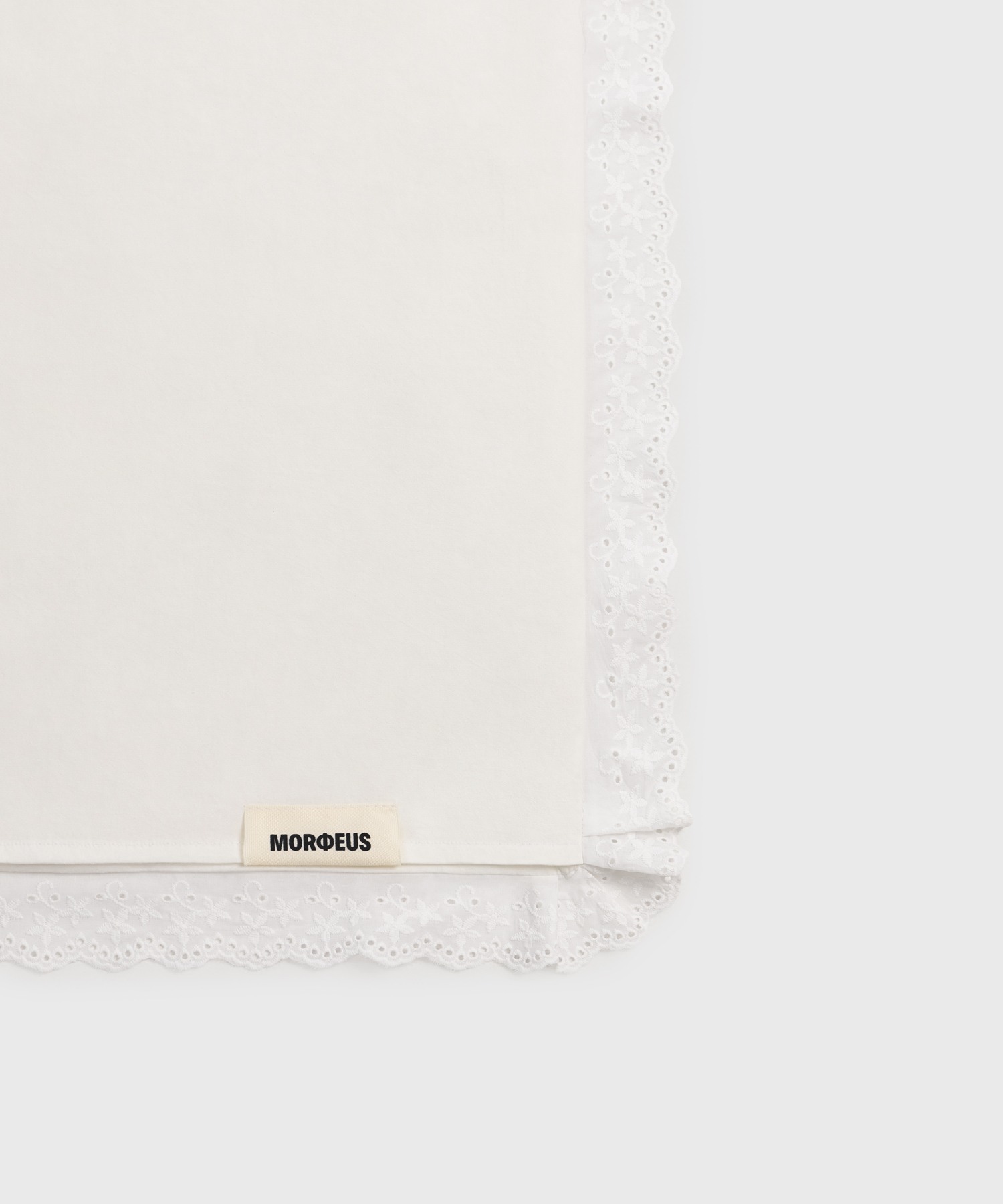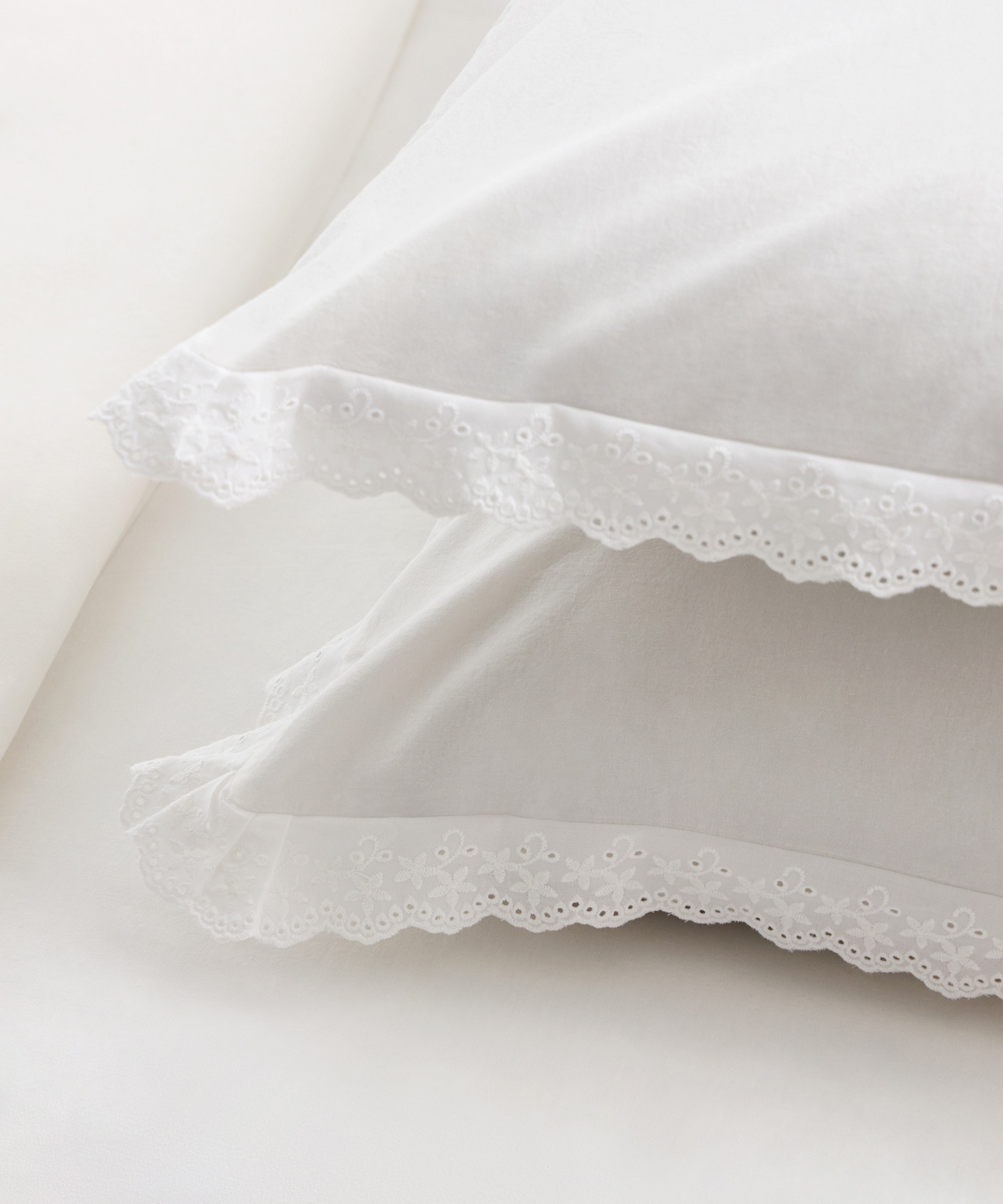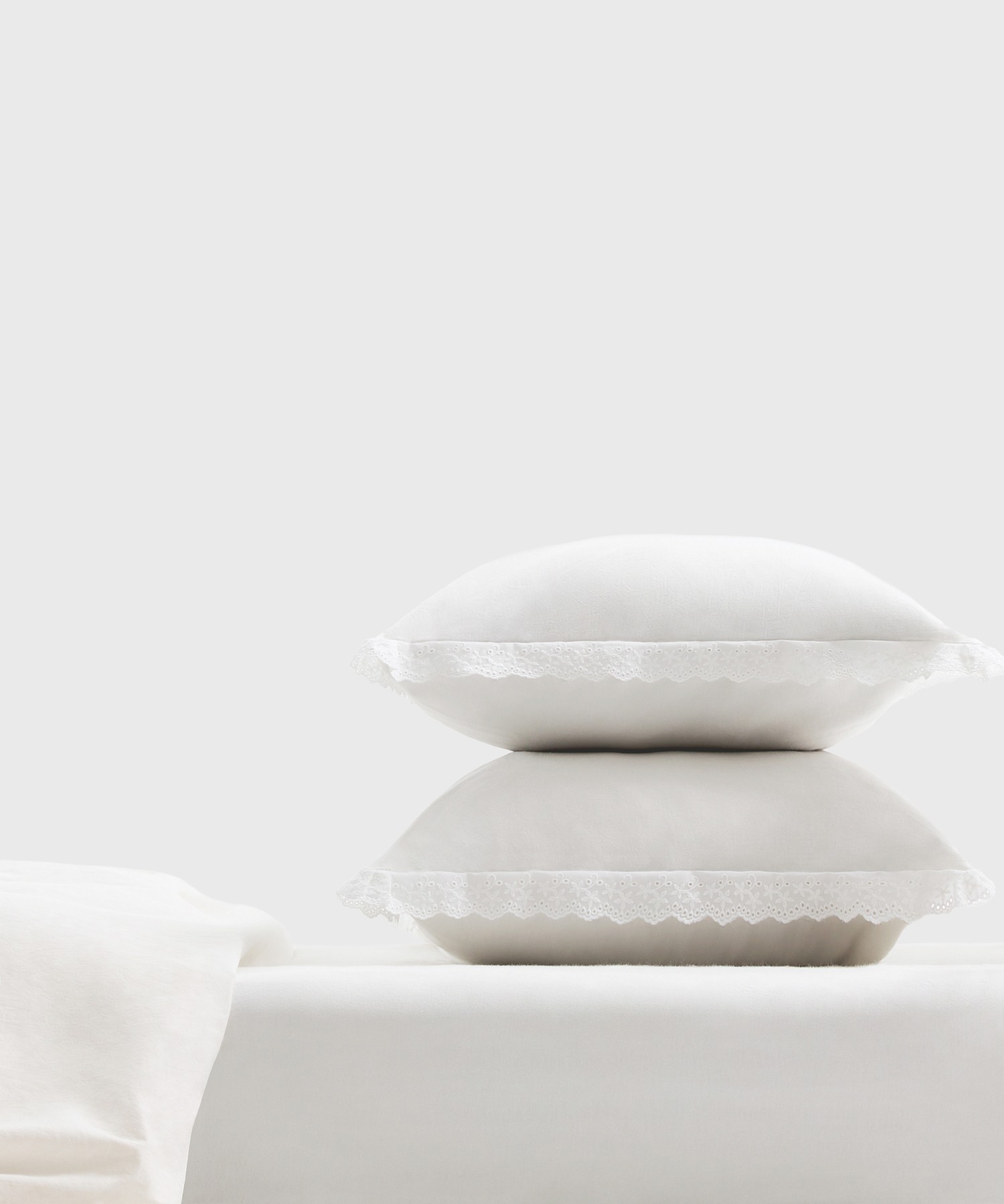 Наволочка из натурального варёного хлопка в оттенке Pure. Край наволочки украшен деликатным кружевом-шитьём, отсылающим к эстетике романтизма и традиции сна на белоснежных пуховых перинах.