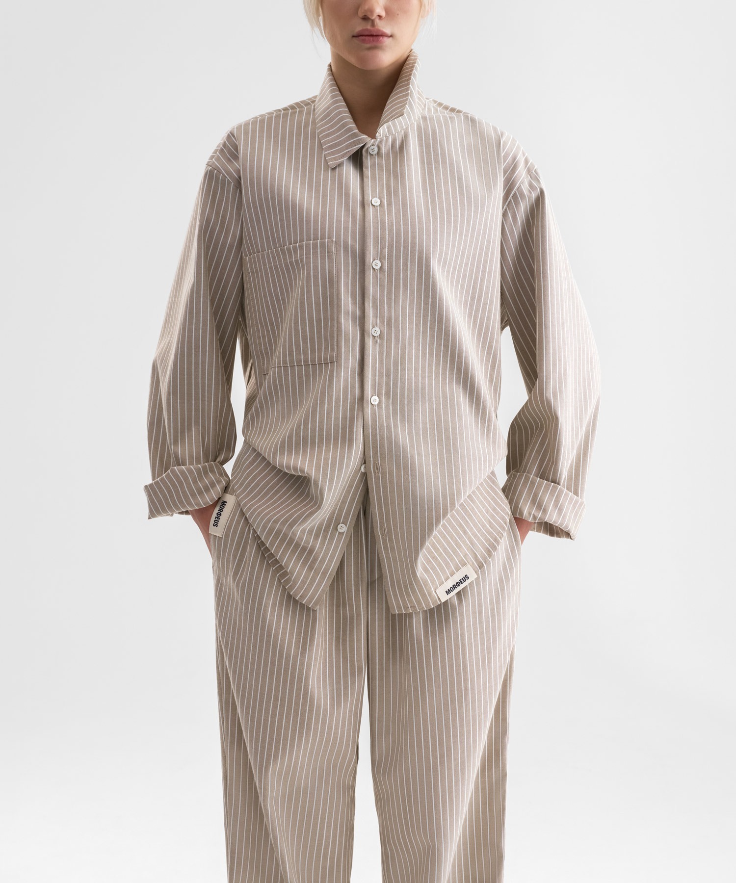 Отложной воротник, один нагрудный карман, застёжка на брендированные пуговицы, скруглённая линия низа. Длинный прямой рукав обработан вчистую — можно небрежно подвернуть для расслабленного настроения. Изнанка выглядит эстетично благодаря закрытым швам.