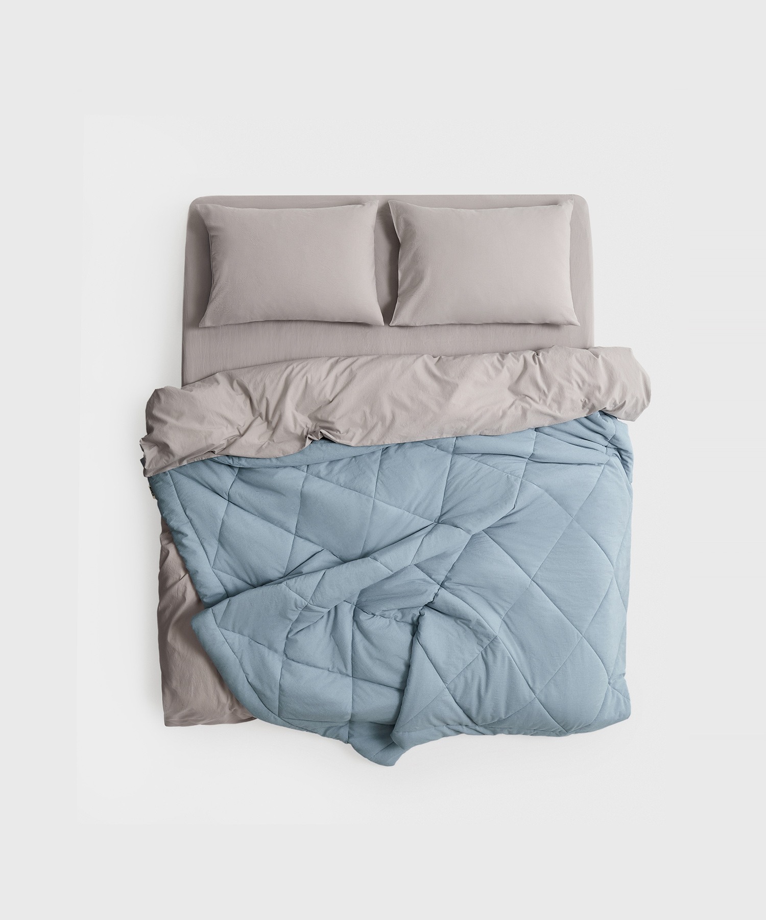 Пододеяльник раскрывается как коробка для пиццы. Вкладываете одеяло внутрь и застегиваете потайную молнию, вшитую по 3-м сторонам
